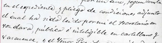 “ … y pliego de condiciones adjunto / el cual ha sido leido por mi, el secretarío, en / voz clara, pública e inteligible en castellano y vascuence.. “