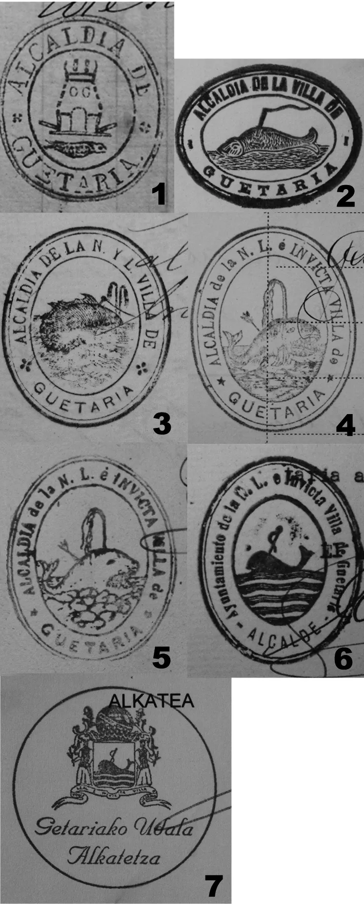 1873. urteko dokumentu batean aurkitu dugu lehen zigilua, zaharrena hau dela esan daiteke (1. zenbakia). Bertan, balea edo balearen errepresentazioa izan nahi duen animalia bat agertzen da gaztelu edo dorre baten azpian. Inguruan “Alcaldía de Guetaria” testua irakurri daiteke. Modu honetan, Getarian bale arrantzak izan zuen garrantzia islatzen da gotortutako hiribildu bat izan zela adierazten den bitartean. Zigilu hau da guztietan berezi eta desberdinena. Aurrerantzean ez zaio hiribildu gotortuari erreferentziarik egingo eta zigilu desberdinetako protagonista nagusi eta bakarra balea izango da. Zigilu honekin batera bada beste bat (2. zenbakia). Lehen aldiz 1886. urtean agertzen da eta bestearekin alderatzen badugu, desberdintasun nabariak ikus daitezke. 1873ko zigiluan gaztelua eta balea genituen protagonista; oraingoan berriz balea izango da protagonista bakarra, “Alcaldía de la Villa de Guetaria” testua lagun duela. Aurrerantzean agertuko diren zigilu berrien aitzindaria da, gailenduko den sinboloaren sustatzailea: bale handi bat, itsasoaren gainean arpoia bizkarrean duela.