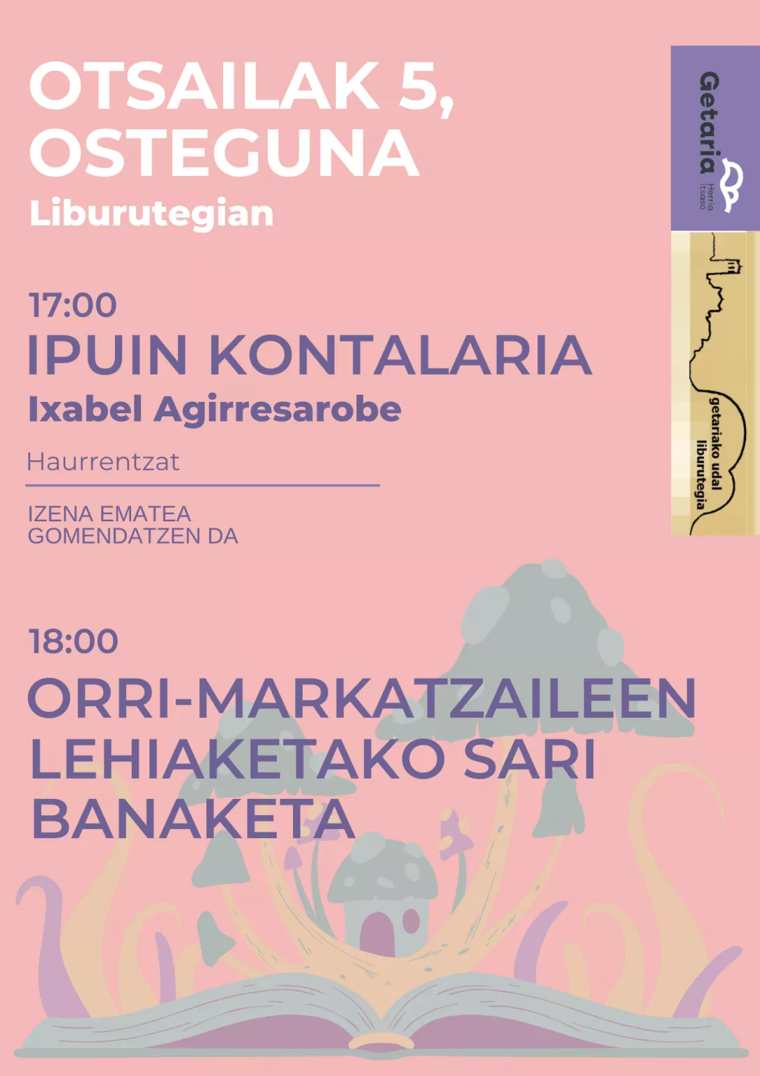 - Ipuin kontaketa saioa: Ixabel Agirresarobe ipuin kontalaria izango da haurrentzat saioa gidatzen 17:00tan.