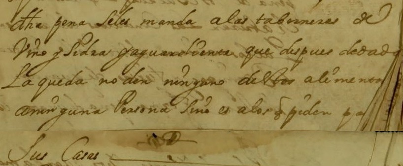 [1] “Que los vezinos y moradores d’este Valle y en espeçial los que están sirbiendo y debaxo de la patria potestad se retiren a su casa de las tauernas y posadas de paraxes donde se vende sidra y aguardientes y de las plazas y barrios. A sauer, de verano para las nuebe oras de la noche y en el ybierno [sic] para las ocho, pena de dos ducados de vellón (…) \y ocho días de cárcel/ y para ello se tocará la canpana de la queda como se acostunbra (079-00039_0004.jpg)
