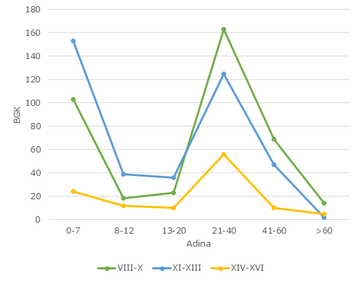 Beraz, Erdi Aroko biztanleen bizitzan momentu zailenak berdinak izango dira beti: 0-7 urte bitartean eta 20-40 urte bitartean (1 grafikoa). Horiek izango dira momentu delikatuenak eta horrela, hezur bildumetan adin tarte horietako banakoak talde handienak osatzen dituztenak.