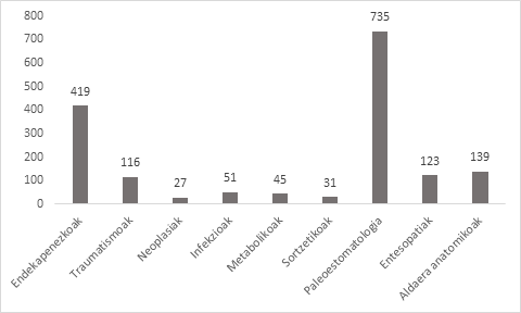 Mota desberdinetako gaixotasunak ikusi dira (2 grafikoa): endekatze-gaixotasunak (artrosia, hezueria, osteokondritis disekatzailea,…), neoplasiak (osteomak, kartzinomak, kisteak,…), infekziosoak (tuberkulosia, bruzelosia, sinusitisa,…), sortzetiko gaixotasunak (malformazioak, lokadurak, arantza bifidoak,…), metabolikoak (osteoporosia, cribra orbitalia, hiperostosi porotikoa,…), paleoestomatologia (txantxarra, abszesuak, hortz supernumerarioak,…), entesopatiak eta aldaera anatomikoak. Hauetaz gain, lehenago aipatutako trepanazio kasu bat eta haurdun hildako emakume baten kasu bat ere aztertu ahal izan dira. Erdi Aroko banako helduek gehien jasaten duten gaixotasuna artrosia izango da, erabilitako bilduma guztietan ikusi da hori dela presentzia handiena duen gaixotasuna, bizkarrezurrean batez ere, lepoaldean eta gerri-ornoetan. Horren ondoren, gehien dokumentatu den hurrengo lesioa hezur hausturak izango dira. Honen inguruan atentzioa deitzen du zonalde anatomiko desberdinak puskatzen direla bizitokiaren arabera. Kostaldean bizi diren banakoek eskuineko besaurreko erradioa hausten duten bitartean, barnealdekoek saihetsak puskatuko dituzte gehiago. Desberdintasun nabarmen honek bi zonaldeetako banakoen jarduerari buruz hitz egiten digu. Ezin da esan zehazki zein izango zen jarduera hori, baina desberdina izango zela begi bistan gelditzen da.
