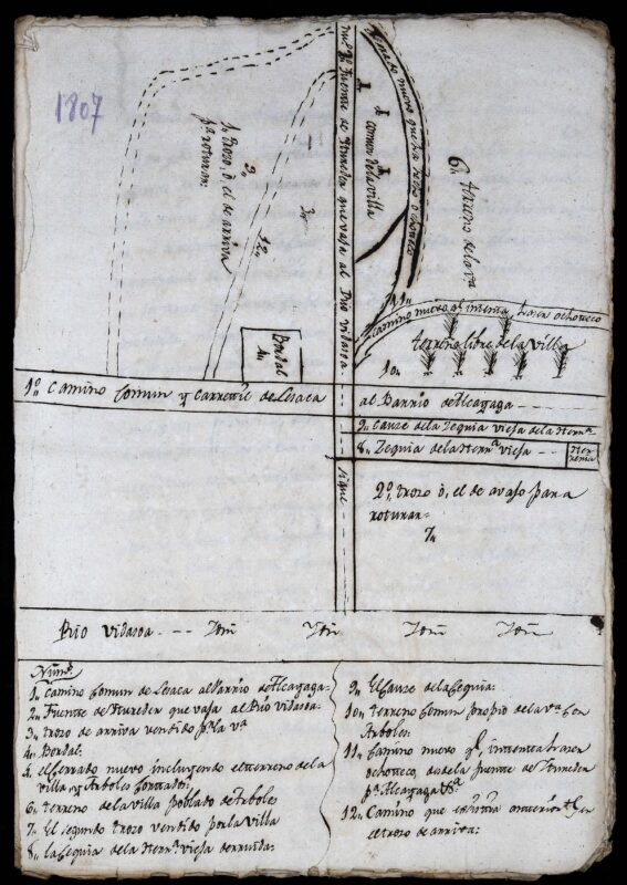 Alabaina, arreta ez dugu horretan jarri nahi. Arreta planoan bertan jarriko dugu. Eskuz egindako plano bat da, erregelarik eta neurketak egiteko tresna berezirik erabili gabe. Gutxi gora beherakoa, zalantzarik gabe. Lursailen kokapena eta María Luciaren senarrak, antza, baimenik gabe eta saladutakoa baino metro gehiago hartzeko asmoz egindako itxitura berrien inguruko informazioa jasotzeko egina dago. Honengatik, kokapena ahalik eta zehatzena izan dadin, plano hauek toponimia eta informazio interesgarri ugari bildu behar izaten zuten. Horrela, gaur esku artean dugun plano honetan biltzen dira besteak beste: Itureder iturria, “Herrería vieja” deitzen duten burdinola eta bere ubidea, Bidasoa ibaia, Alkaiaga auzoa eta Erramoegi parajea.