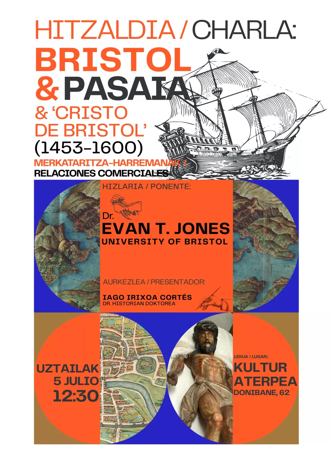 Uztailak 5, eguerdiko 12:30tan eta Pasai Donibaneko “Kultur Aterpea” aretoan, Bristoleko Unibertsitateko irakasle den Evan T. Jones doktoreak hitzaldia emango du. “Pasaia, Bristol and ‘El Cristo de Bristol’ (c.1453-1600)” izenburupean, Pasaiako badiak eta Bristolek XV eta XVI. mendeetan garatu zituzten merkataritza-harremanak hizpide izango ditu hizlariak. Harreman horiek, gainera, herriko parrokian gordetzen den ondarean isla dute, “Bristoleko Kristoa” irudian. Hori dela eta, ikertzaileak artelan hori ere hizpide izango du.