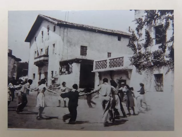 Irudia: Adunako herritarrak festetan herriko plazan dantzan, 1940 hamarkada (sig. 459-01). Adunako udal artxiboko irudia