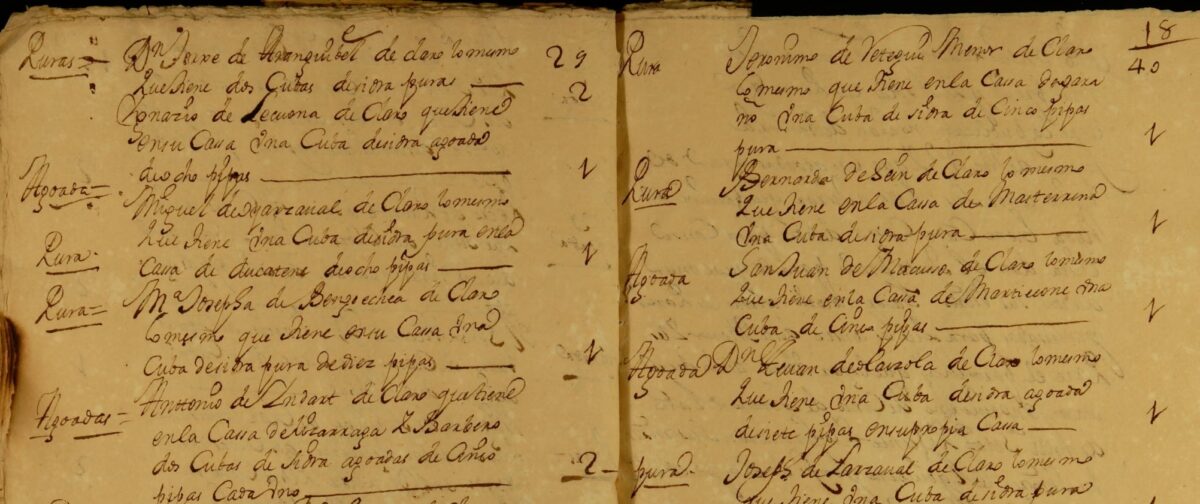 Horien artean, sagardo-saltzaileekin zerikusia duten hainbat idatzi topa ditzakegu. Hauetan, auzune ezberdinetan saltzeko sagardo garbiz edota “bataiatuz” (urarekin nahastutako edaria, alegia) betetako upelak zituztenen zerrendak ageri dira. Aurretiaz aipatutako dokumentuekin alderatzen baditugu, zenbait desberdintasun ikusteko parada izango da: batetik, auzo edo biztanleen araberako erroldak dira, nahiz eta sagardo jabe bakoitzak upak zer etxetan dituen adierazi; bestetik, aipamen gutxi diren arren, zerrenda guztietan emakumeen izen-abizenak ageri dira, sagardo ekoizpen, salmenta eta tabernen munduan garrantzi handikoak baitziren Aro Berriko gizartean, baita Oiartzunen ere. Hor daude, besteak beste, 1720ko erregistroan agertzen diren Maria Josefa Bengoetxeakoa, 10 upamehetako upa bat sagardo garbi bere etxean duena, edo Bernarda Seingoa, Masterrena etxean upa bat sagardo garbi daukana.