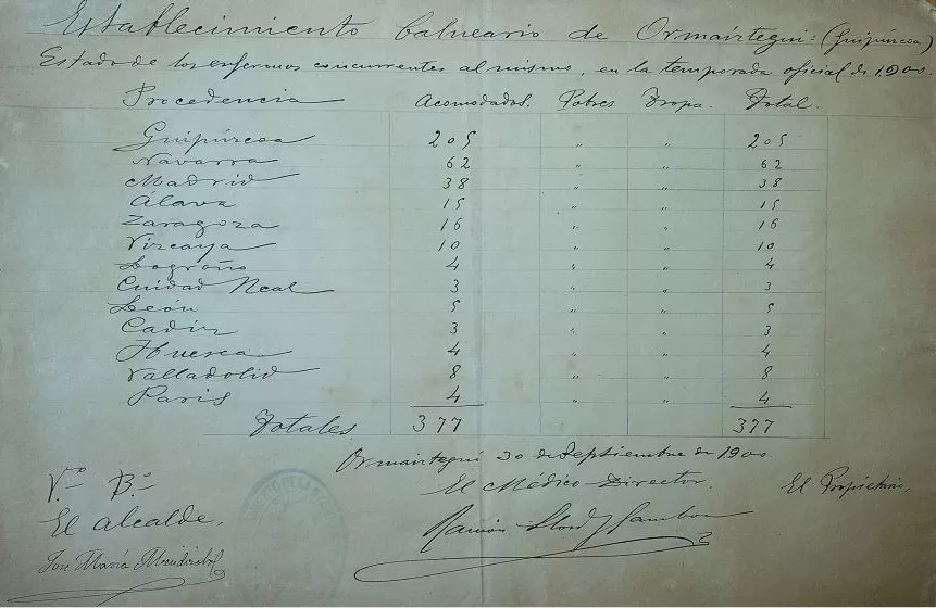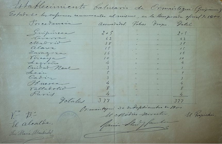 *Ormaiztegiko bainuetxea (Gipuzkoa). 1900eko denboraldi ofizialean bildutako gaixoen egoera. Iturria: Ormaiztegiko Udal artxiboa.