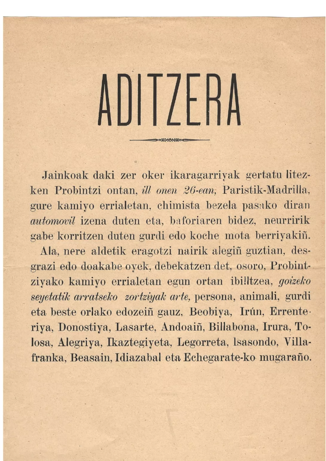 “Jainkoak daki zer oker ikaragarriyak gertatu litezken Probintzi ontan, ill onen 26-ean, Paristik-Madrilla, gure kamiyo errialetan, chimista bezela pasako diran automovil izena duten eta, baforiaren bidez, neurririk gabe korritzen duten gurdi edo koche mota berriyakiñ”
