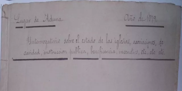 1879 urteko urriaren 14an, Gipuzkoako Gobernadore Zibilak zirkular bat bidali zien probintziako herrietako alkateei galdeketa bat eginez, gai desberdinei buruzko datuak jaso nahian (sig. 704-11). 23 galdera dira guztira eta Udal zerbitzuei buruz, erlijioari buruz eta herriko ekonomiari buruzko gaiak jorratzeko eskatzen dute. Zerbitzuen inguruan, hilerriaren egoera zein den jakin nahi dute alde batetik, eta ea hilerri zibila dagoen galdetzen dute, horretaz gain, mediku zerbitzuari buruz, ostalaritzaren kudeaketari buruz, suteen aurkako zerbitzurik dagoen ala ez, eskola erlijiosoak edo-eta partikularrak dauden, aurrera eramandako obra publikoei buruz eta hauteskundeei buruz galdetzen dute. Azken honen inguruan, azkenekoz ospatu ziren hauteskundeetan parte hartu zuten hautesleen zerrenda eskatzen dute eta baita ere, udal zinegotzien zerrenda, zehazki, horien artean nork dakien idazten edo-eta irakurtzen eta nork ez da jakin nahi dutena. Erlijioari dagozkien galderen artean, aipatutako hilerriaren eta eskolen galderarekin batera, zenbat eliza dauden eta horien egoerari buruzko informazioa bidaltzeko eskatzen dute. Azkenik, herriko ekonomiari dagokionean, ea Udalak diru mailegurik kontratatuta duen eta baiezkoa bada, zenbatekoa eta zertarako den jakin nahi dute; bestalde, feria edo merkatua ospatzen den galdetzen dute, noiz, non eta ekonomikoki zenbateko garrantzia duen azaldu beharko du alkateak; herri ustiapenerako bideratuta dauden ondasunen zabalera eta garrantzia ere bai; abeltzaintzako animalia kopurua eta zertarako erabiltzen den bakoitza; eta urteko zenbat sagar jasotzen diren ere galdetzen dute inkesta honetan. Ez dira ez, edonolako gaiak hemen jasotzen direnak. Gobernadoreak hilabeteko epea ematen die alkateei erantzuteko eta Adunak 1879ko azaroaren 11an bidaltzen ditu bere erantzunak, sakonki erantzun duela dio gainera, agindu zaiona egoki betez.